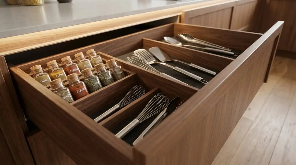 Among the most sophisticated kitchen cabinet trends of 2026, integrated appliance panels create seamless kitchen environments where appliances disappear into the cabinetry.