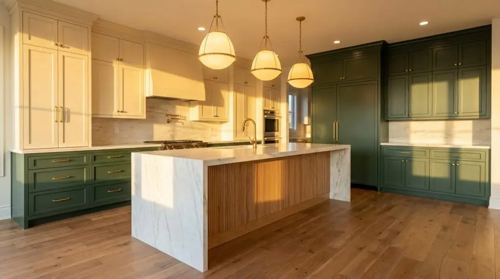 The most dominant kitchen cabinet trends in color for 2026 move decisively away from all-white kitchens toward warmer, more personal tones. Sage green leads the color movement, followed by warm mushroom, deep navy, forest green, and dusty blue. Two-tone combinations pairing lighter uppers with deeper lower cabinets represent the single most popular approach, allowing homeowners to incorporate color while maintaining visual balance and broad appeal.